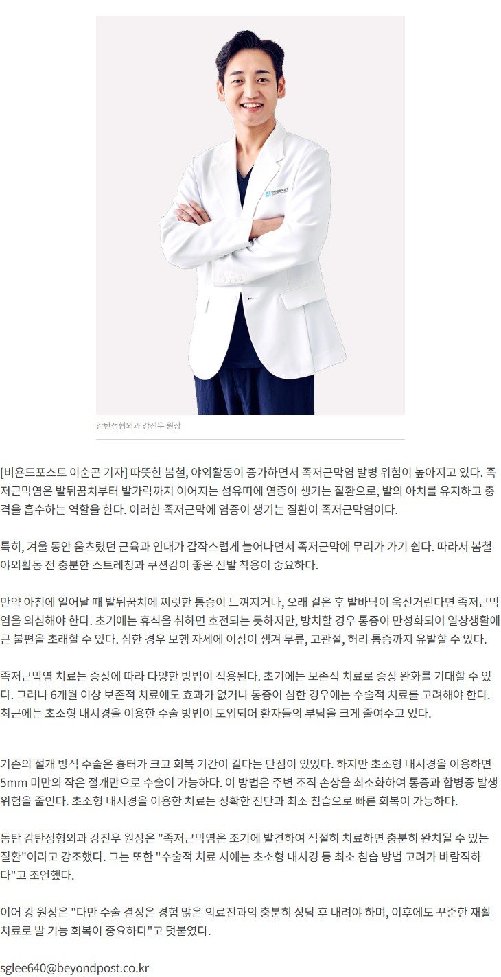 제목 [언론보도] 일상생활 지장 주는 족저근막염, 초소형 내시경으로 수술 부담 줄여