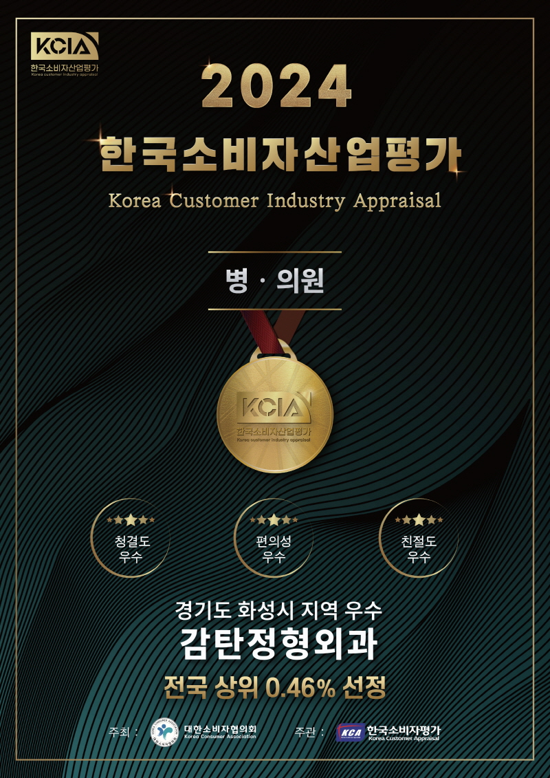 동탄을 대표하는 감탄정형외과는 대한소비자협의회가 주최하고 한국소비자평가가 주관하는 2024 KCIA 한국소비자산업평가 병ㆍ의원 분야에서 우수 병원으로 선정되었습니다.