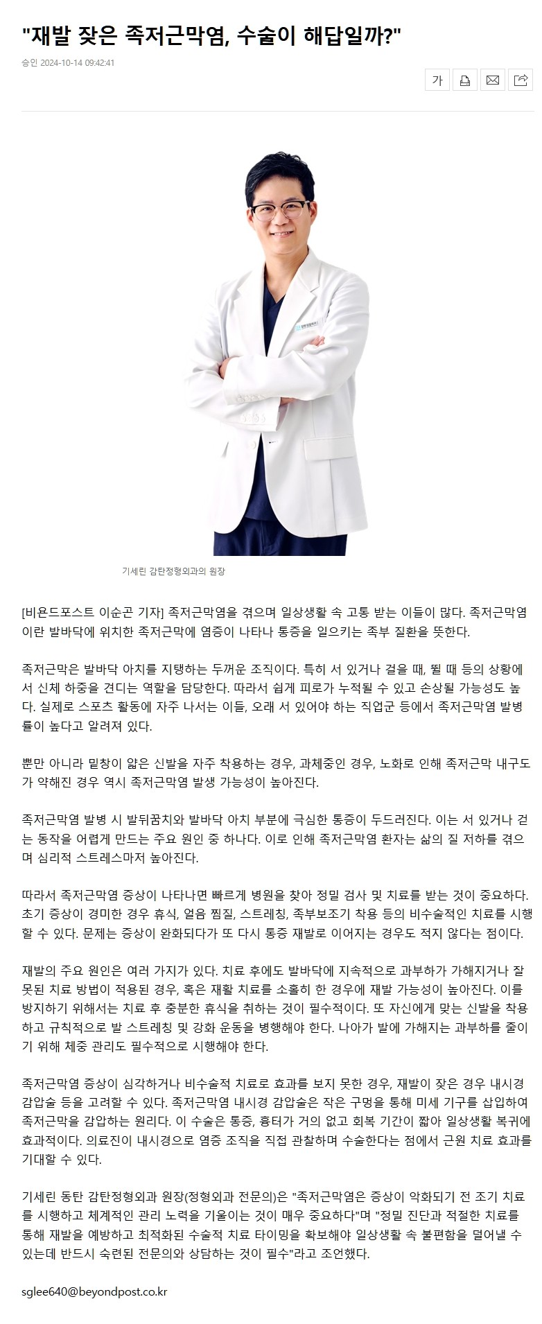 제목 재발 잦은 족저근막염, 수술이 해답일까?