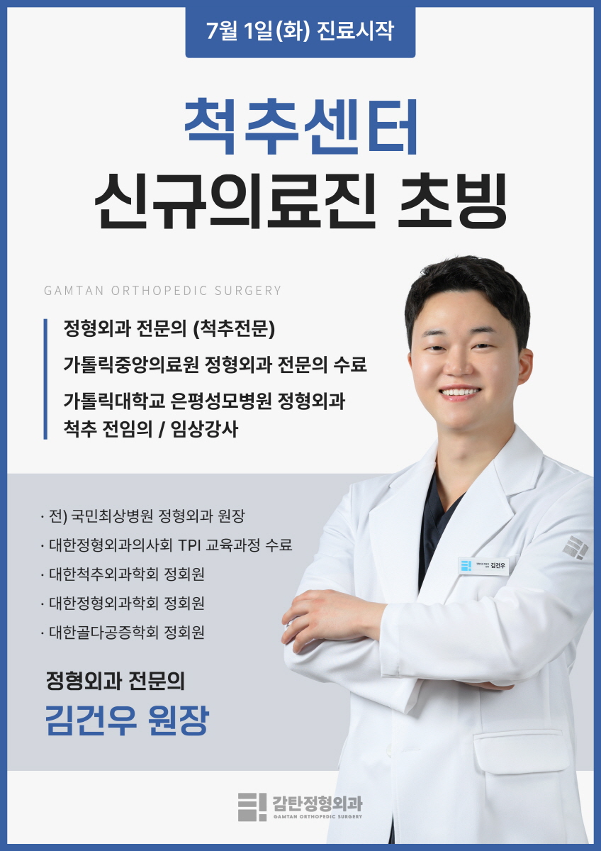 김건우 원장님 진료 시작! 정형외과 x 신경외과 협진 강화로 척추 진료의 새 지평을 엽니다. 감탄정형외과 척추센터에 기분 좋은 변화가 찾아왔습니다! 2025년 7월 1일 (화)부터 정형외과 척추 전문 김건우 원장님께서 새롭게 진료를 시작하며, 기존의 신경외과 중심 진료에 더해 정형외과적 시각을 겸비한 폭넓고 세밀한 척추 진료가 가능해졌습니다.
