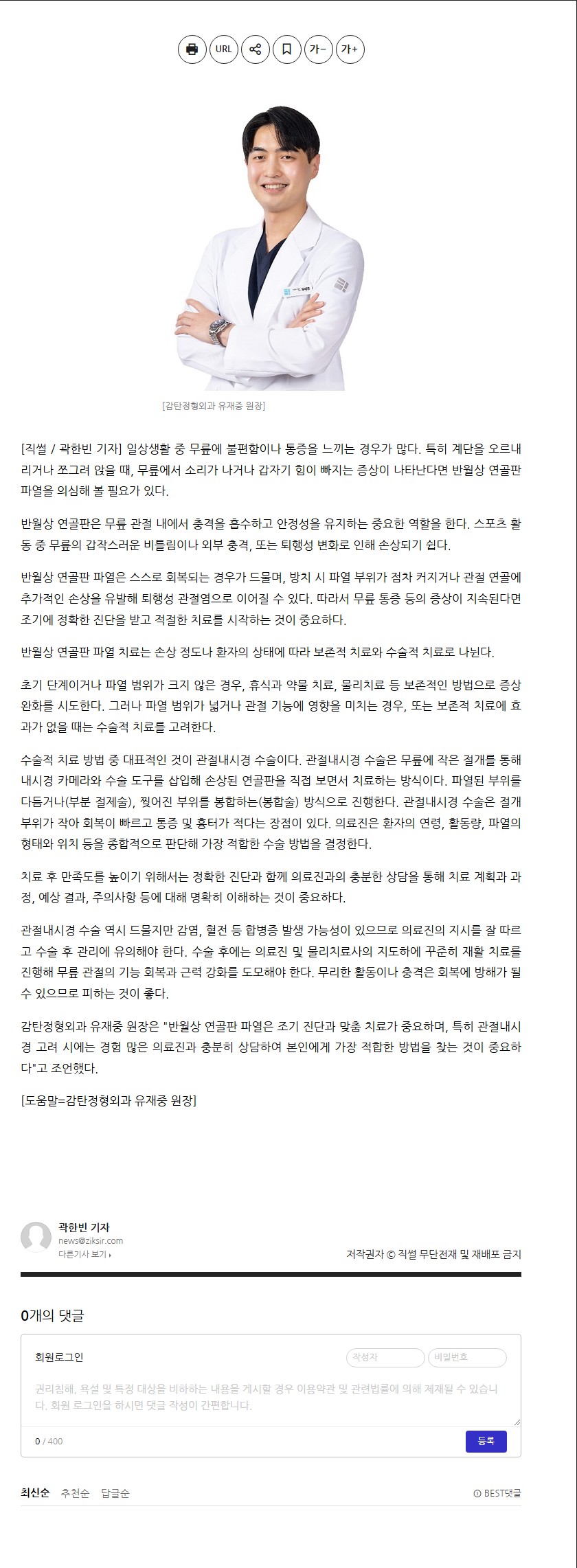 제목 [언론보도] 무릎 통증 ‘반월상 연골판 파열’ 의심…방치하면 관절 악영향