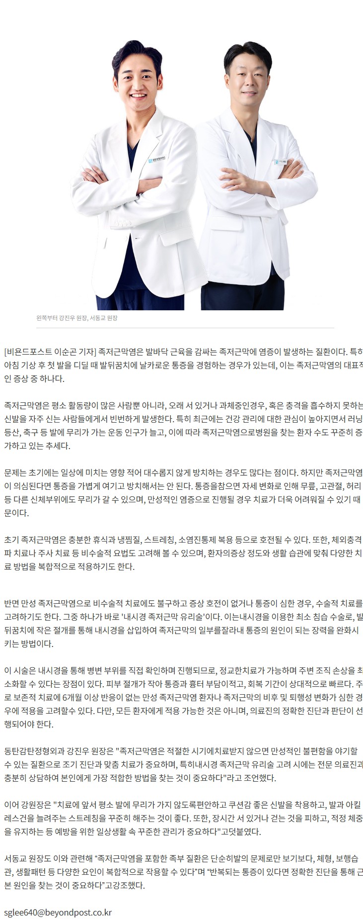 제목 [보도자료] 족저근막염 수술, 더 작고 섬세하게! '내시경 족저근막 유리술'의 원리는?