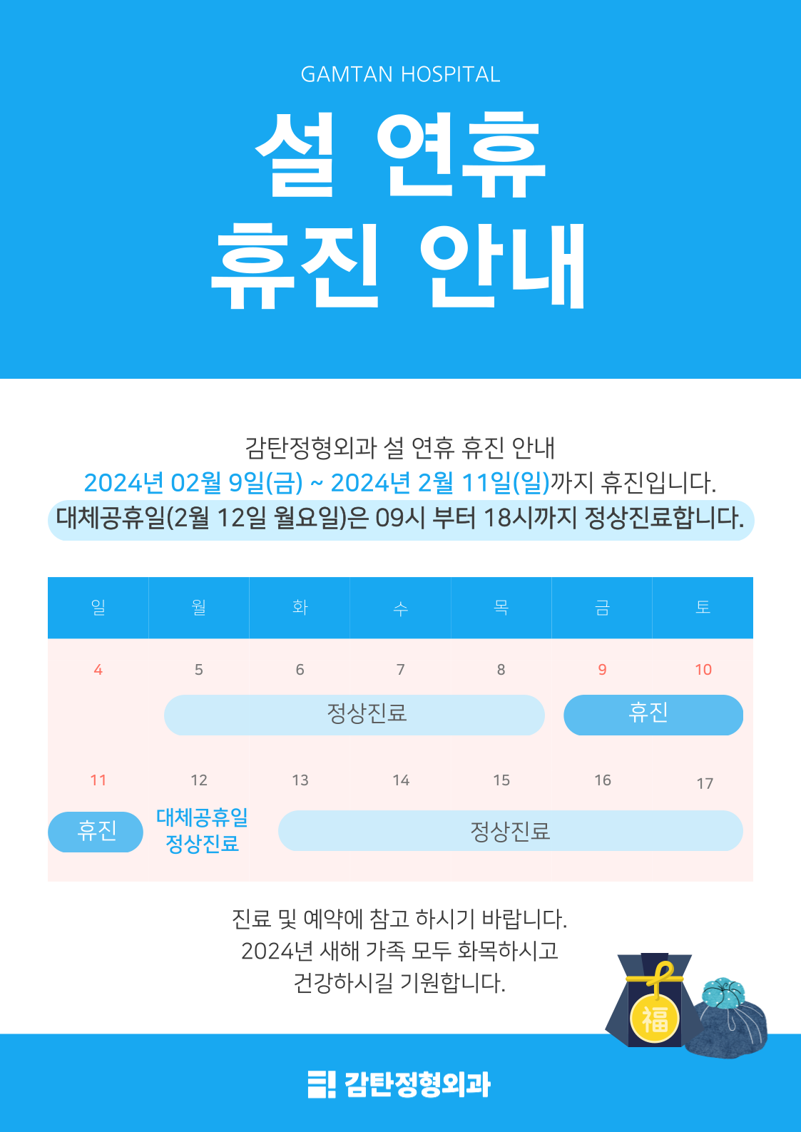 감탄정형외과는 2월 9일(금) ~ 11일(일)까지 휴진이며,