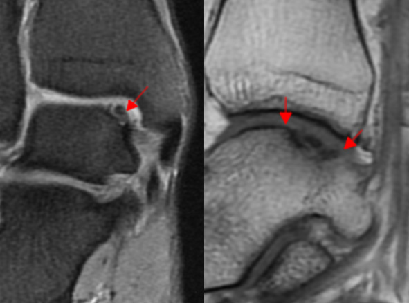 발목 염좌, 골절, 탈구 등 급성 외상으로 인해 연골이 손상될 수도 있으며, 과도한 사용으로 인해 발목 관절에 반복적인 충격이 가해지면