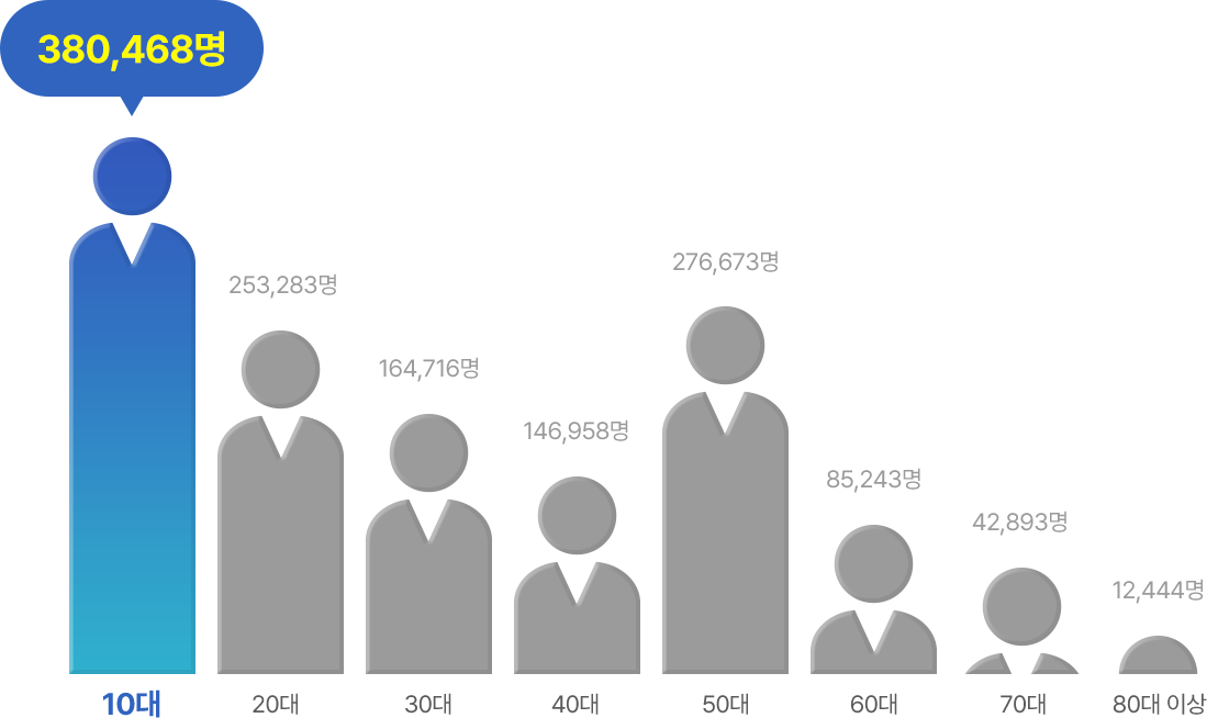 비교적 신체활동이 높은 10대 환자가 380,468명(약 27.9%)으로 다른 연령대보다 더 많이 발생하고 있습니다.