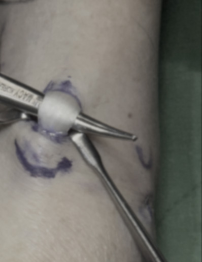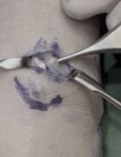 개방형 제1신전지대 유리술은 다음 그림 처럼 1.5~2cm 정도의 횡방향의 최소 절개로
