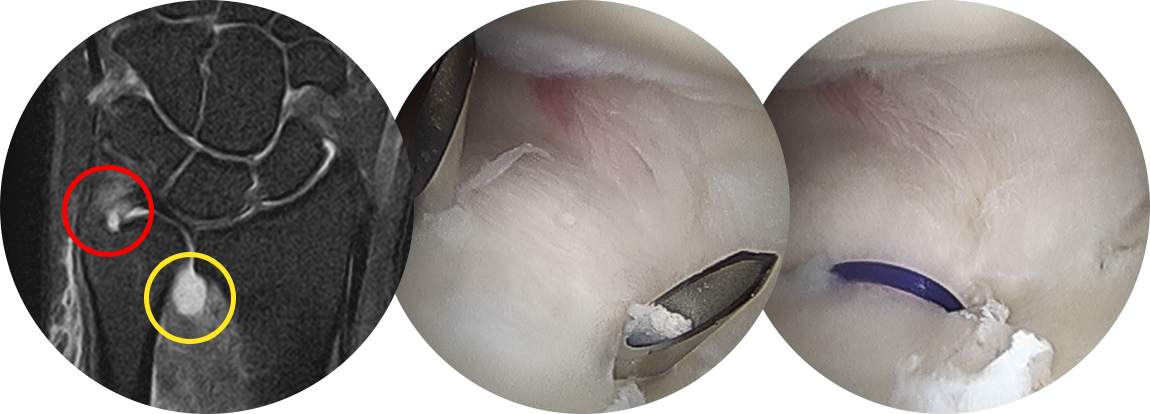 삼각섬유연골복합체 파열이 있을 경우 MRI 에서 다음과 같이 뼈 부착부에서의 파열(빨간 원)과
