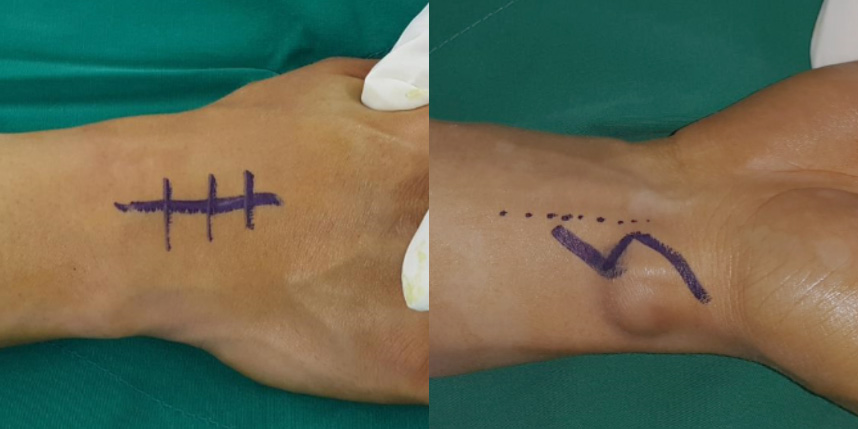손등의 횡절개 방법은 가장 미용적이며, 상처에 의한 통증도 덜 남는 절개 방법으로 손등쪽 결절종에 경우 대부분 적용 가능합니다.